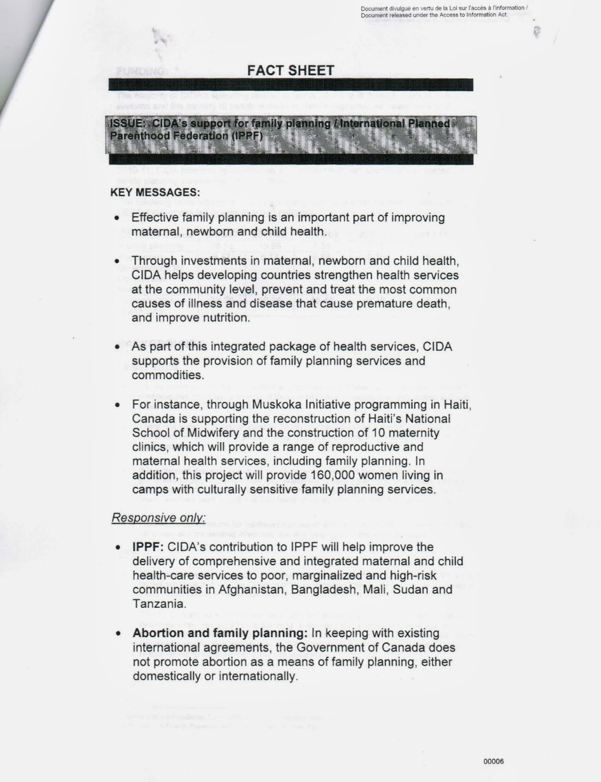 Below are some of the more interesting pages, that appear to be briefing notes to the Minister, regarding IPPF's funding of $6 Million, that mention abortion and how we don't fund it.